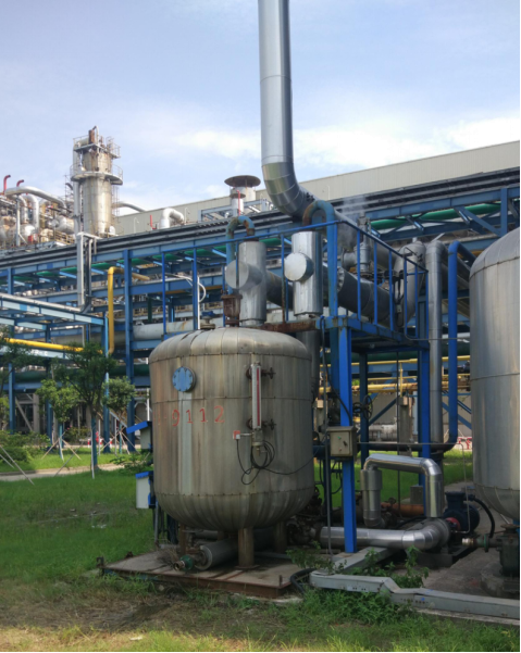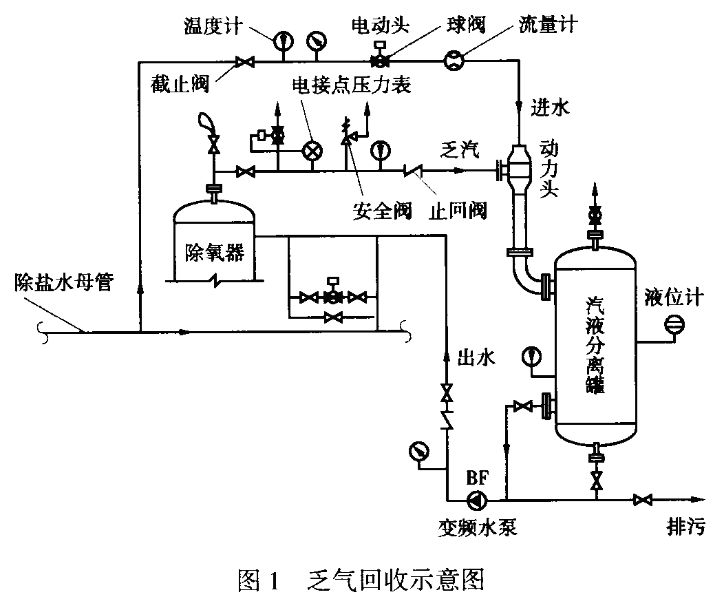 将除氧器排气(汽)从进汽口引入余汽回收罐,使其与从进水口引入的补充水或凝结水进行混合传质,在内部传质介质的作用下,水、汽充分接触,“进水”将“进汽”所含的水蒸汽吸收后从罐底出口排入疏水箱中,不凝气从罐顶放空口排入大气。