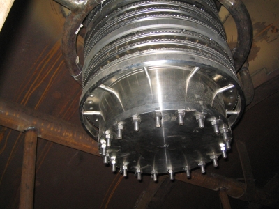1.碟型喷嘴的关键元件是由不锈钢材料制成的平衡碟片。这些碟片周边开空夹在一起,用拉杆拉紧。在喷嘴中,安装有一个流量分配器,上面有开有小孔的区 域和一个灰尘收集区。在后部区域有一个底部分配器,并包含有一个防涡流装置。在喷嘴的周边区域有一定数量的对中心环来防止碟片在传输中以及除氧器安装及拆 卸中受损。水由联接主凝结水的管路进入喷嘴,通过流量分配器和夹片间的小孔,主凝结水进入碟片间。由于喷嘴中的压力与除氧器蒸汽空间的压差作用实碟片张 开,主凝结水形成水膜状。碟片周围的齿形设计,保证水膜交错,以获得*佳的水滴。在周边有均布的凹槽,在承受外压时,这些凹槽对弹性碟片起支撑作用。